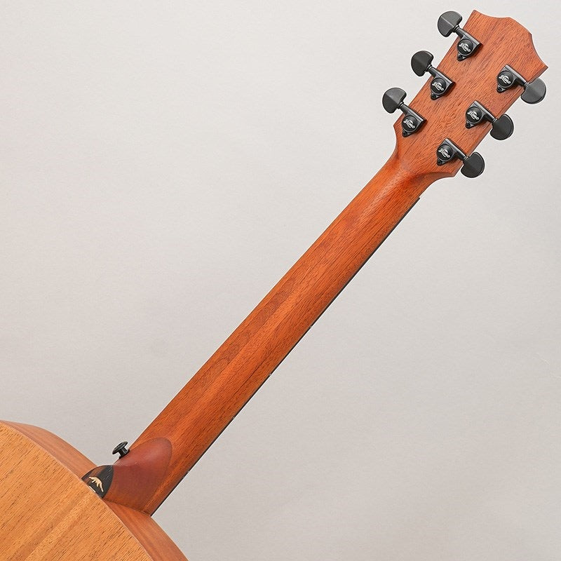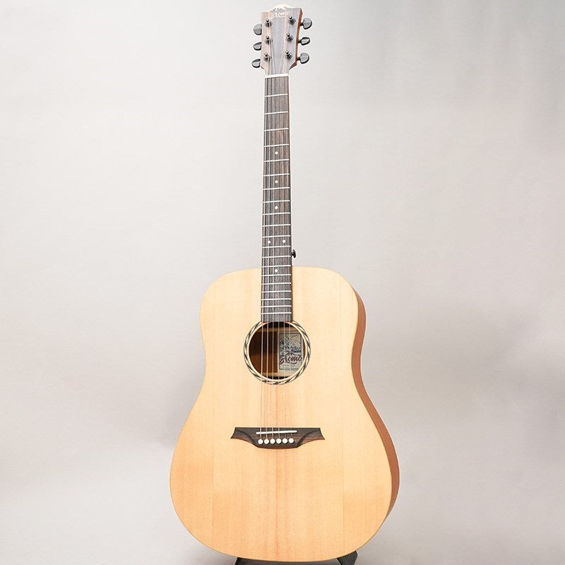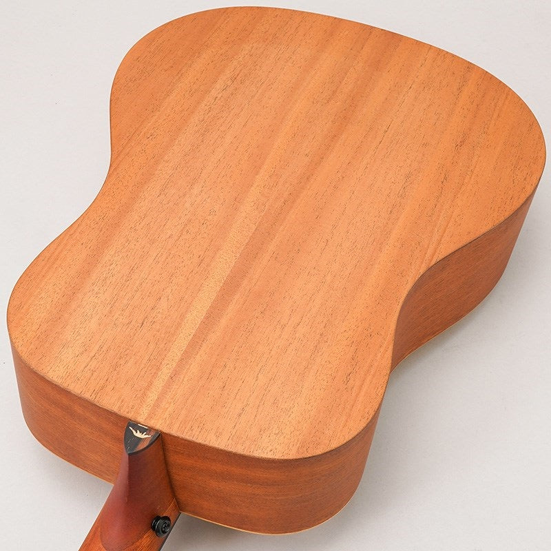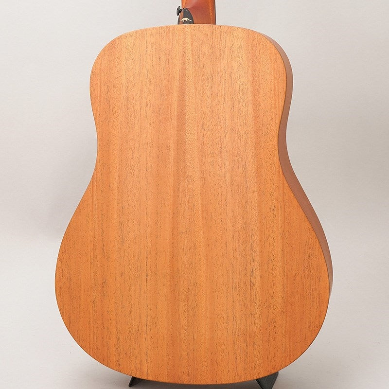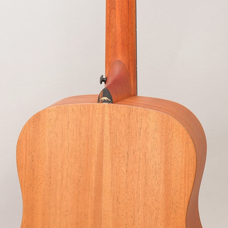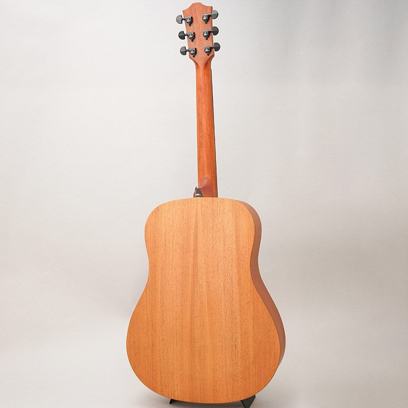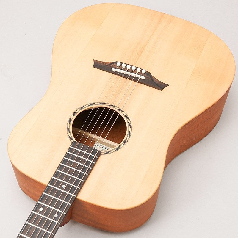 The solid spruce top is paired with carefully selected mahogany plywood back and sides. Spruce offers a crisp, clear tone and captivating sustain, while the mahogany back and sides add warmth and fullness. The dreadnought shape, beloved by many guitarists, produces deep bass and sparkling highs.