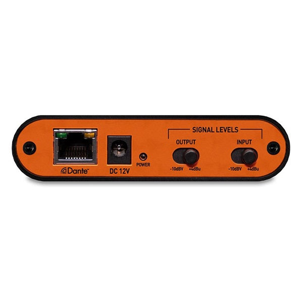 Key Features: Dante network audio interface with two analog inputs and two analog outputs. Reference-level audio quality suitable for professional use. Inputs and outputs support audio levels of -10 dBV (consumer) and +4 dBu (professional).