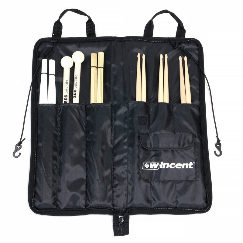 It can store up to six pairs of sticks, rods, brushes, mallets, etc.