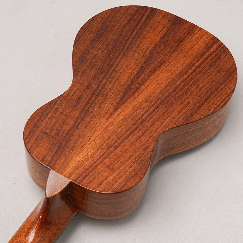 Even though it's a simple ukulele, it has intricate details, such as the head shape, triangular sound hole, and abalone inlay on the head.