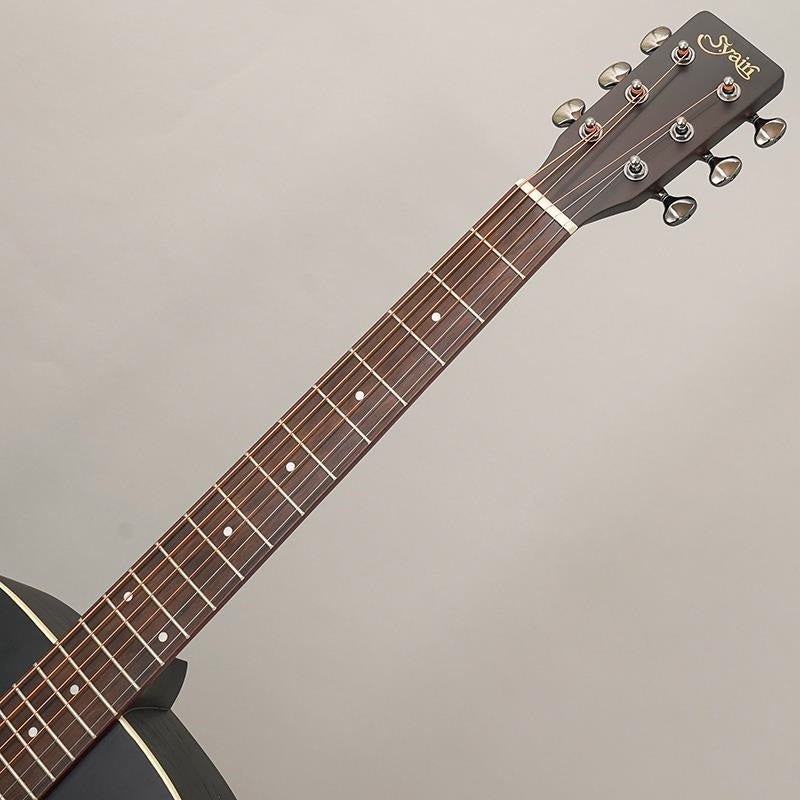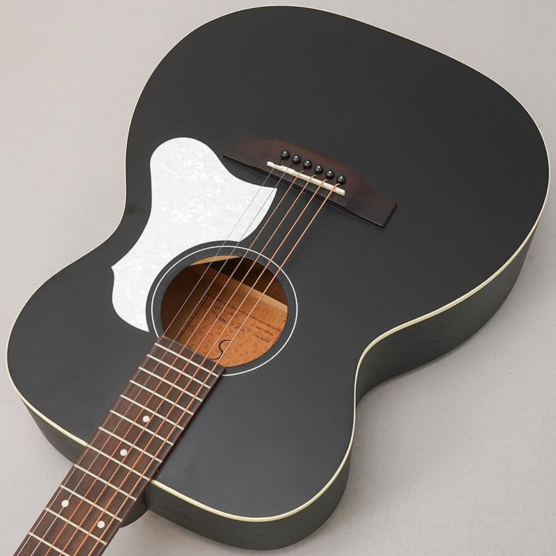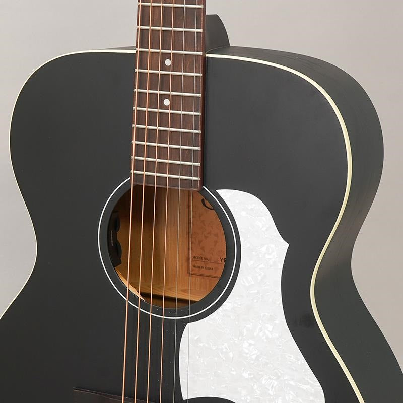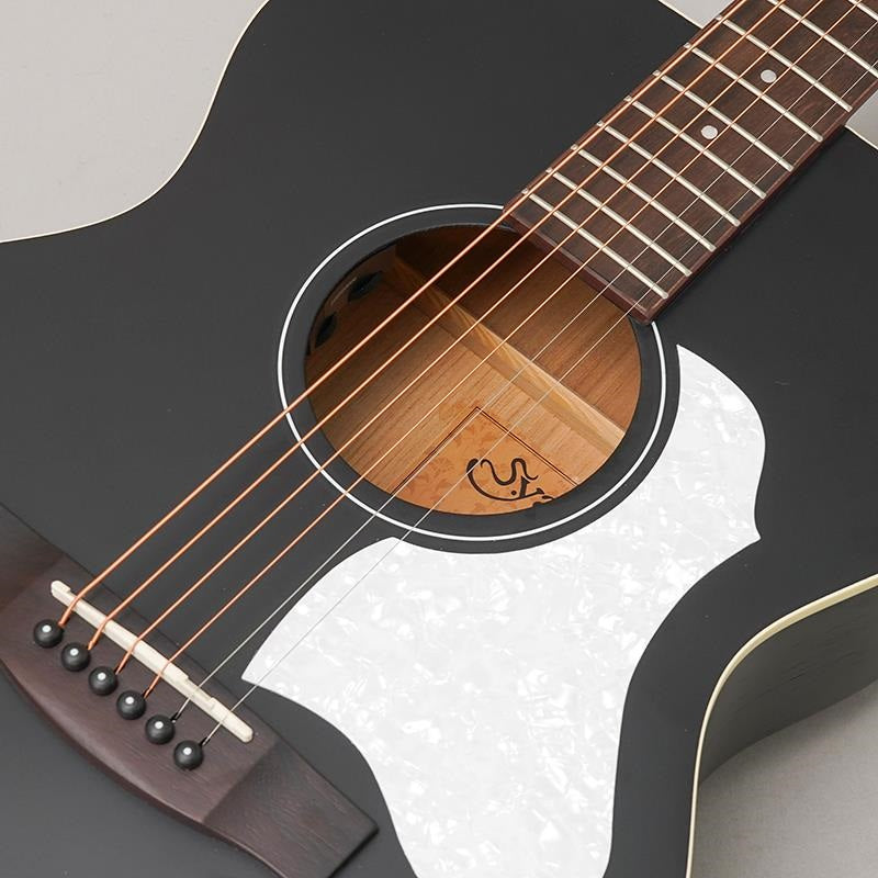 This modern-style electric acoustic model features a warm, nostalgic head shape, gunmetal black tuning keys, and a white pearl pickguard that accentuates the body color, making it a truly unique piece.