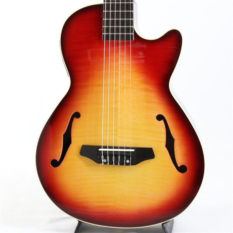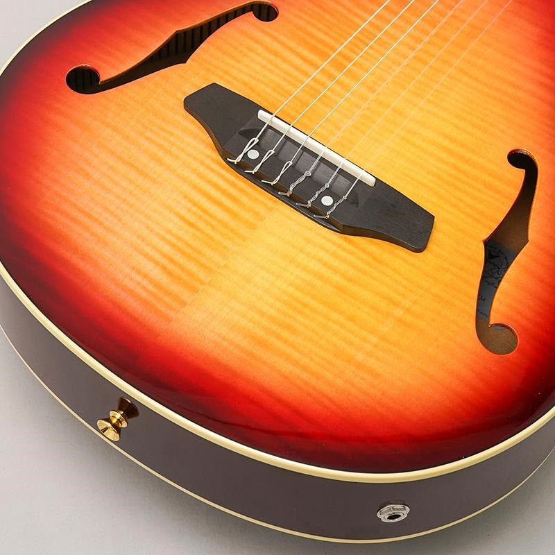 A small body with a realistic sound. The borderless hybrid acoustic "KYF" blends tradition and innovation in a way that is characteristic of K. Yairi. This compact, thin-bodied acoustic guitar with F-holes is easy to hold and play, allowing you to produce a warm, booming sound anywhere. While its small size may not offer the greatest volume, the Fishman Presys+ pickup system more than makes up for it, making it a highly functional electric guitar.