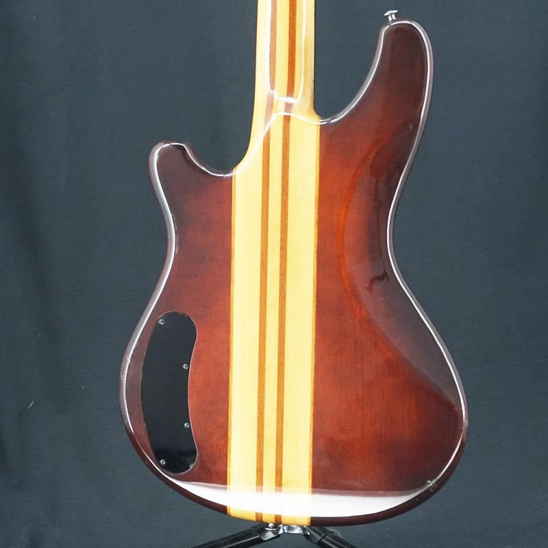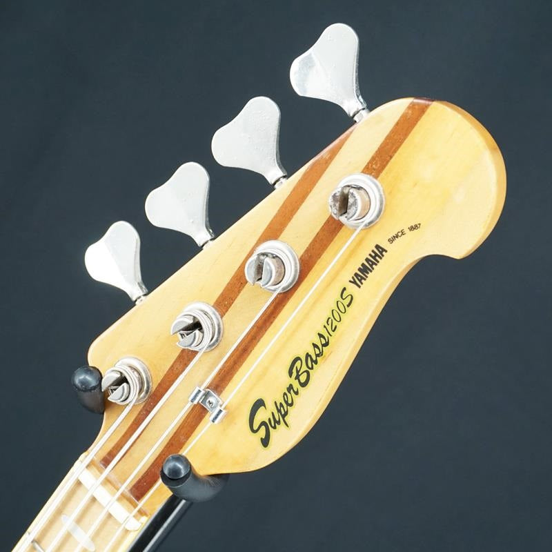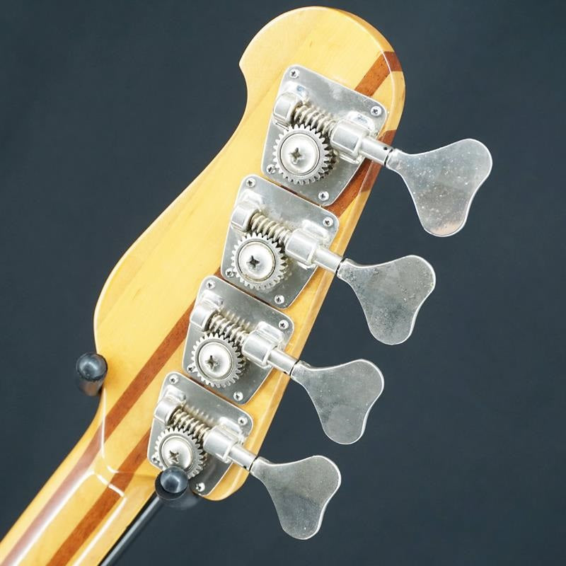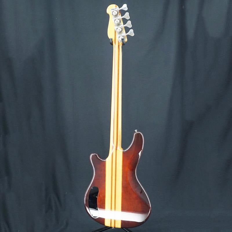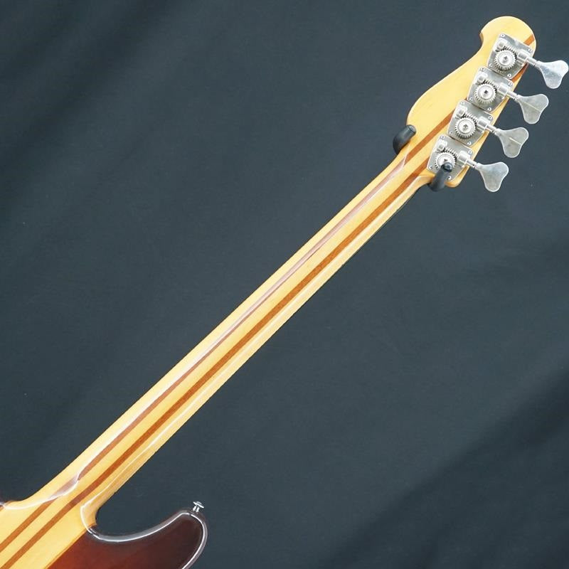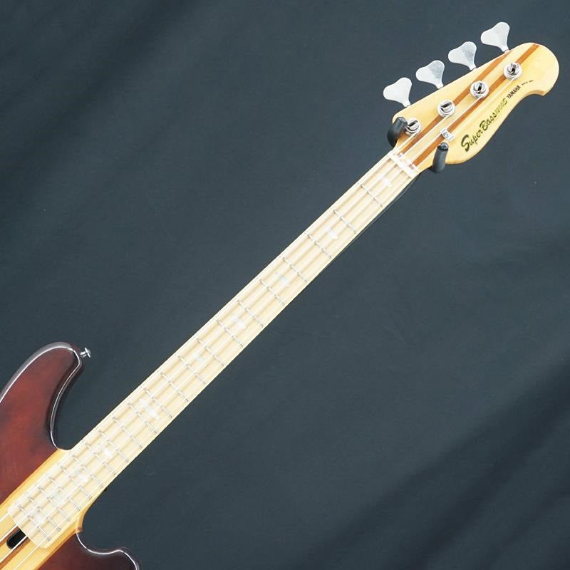 This particular SB1200S was produced in the late 1970s and early 1980s. It features a unique body shape, nato wood, maple, and mahogany neck-through construction, and two 8-polepiece pickups. Its aged condition, including some paint chipping and scratches, and tarnished metal parts, adds to its appeal. The nut width is approximately 43mm, and the neck shape is sturdy.