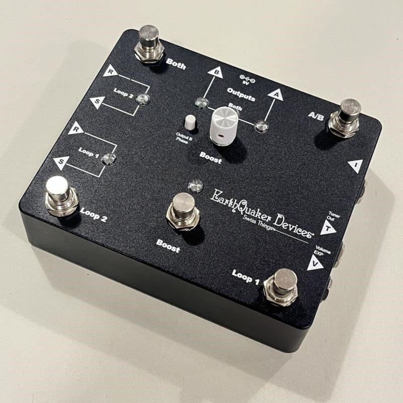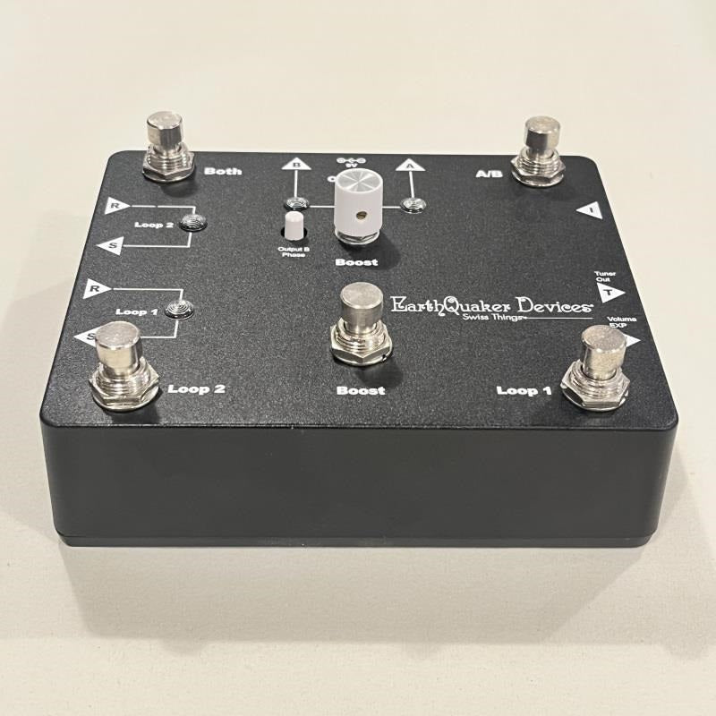 ■What you can do with Swiss Things ・Use multiple pedals without worrying about sound degradation ・Quickly and easily bypass all pedals ・Flexi-Switch can be used with any pedal you use ・By using the volume control of the external expression function, you don't have to worry about sound quality degradation that comes with using a normal volume pedal ・Resolves problems such as phase issues, ground loops, and noise when using multiple amplifiers ・By consolidating the signal input and output locations, you can compactly organize pedals on your pedal board, preventing sound quality degradation caused by running long cables