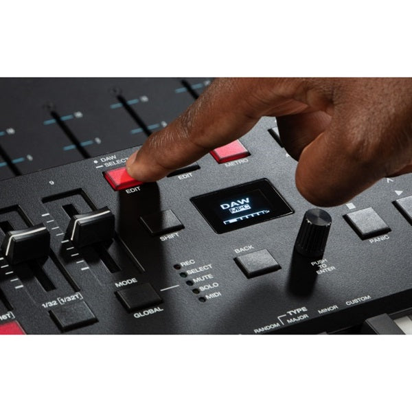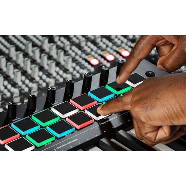 Key Features: 49 semi-weighted keys with best-in-class velocity and aftertouch, assignable to various functions. 16 RGB-backlit, velocity-sensitive/assignable pads with Note Repeat functionality for beat making and clip launching.