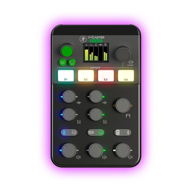 - USB connection for use as a PC audio interface - Bluetooth connection for wireless audio transmission and reception - Audio can be transmitted and received by connecting to the headphone output of a smartphone - Automatic mix-minus function for smartphone input - MixViewer color display for instant confirmation of levels and settings - Sampler function with four dedicated buttons for transferring and saving audio files directly into M-Caster Studio - RGB LED light with 15 colors to choose from