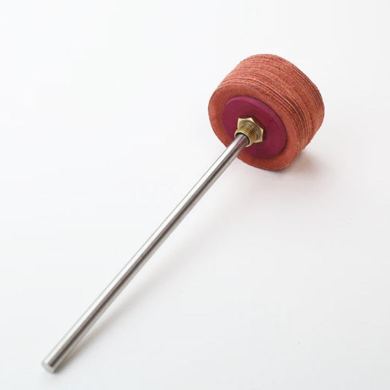 The kick drum beater is modelled on a Viennese timpani mallet and is made from closely stacked discs of flannel, canvas and leather.