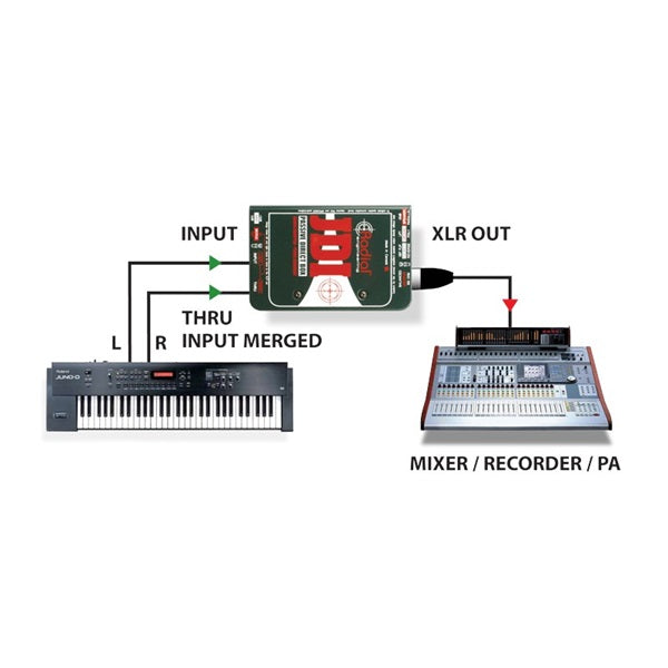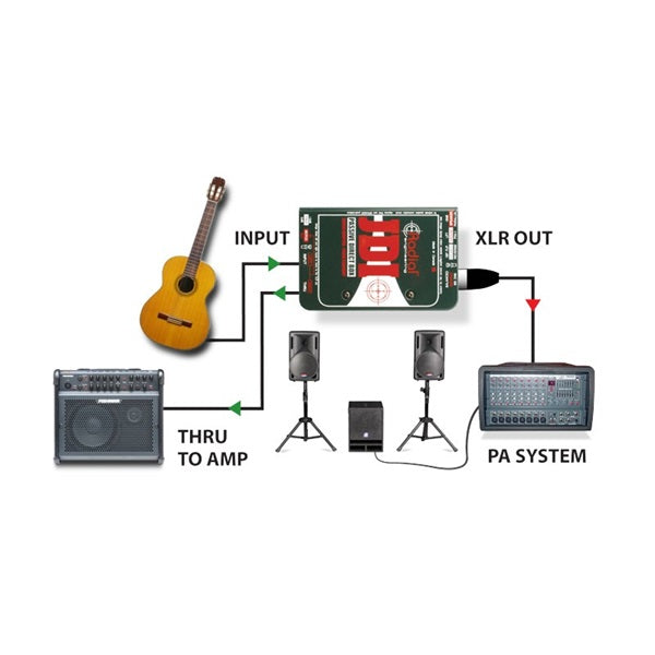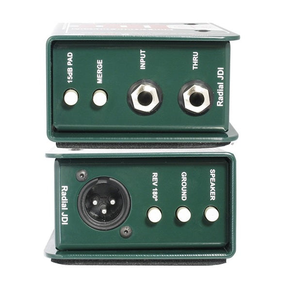 In addition to the phase reverse switch, 15dB pad switch, and ground lift switch required for a direct box, the RADIAL JDI also features its own unique stereo to mono switch and parallel speaker switch.