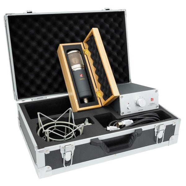 The microphone itself is housed in a wooden case, and is packed in a sturdy aluminum flight case along with a shock mount, a dedicated power supply with directional switch, and cables.