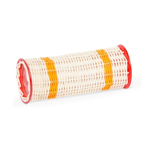 The plastic part on the bottom produces a loud sound, while the woven body produces a light sound.