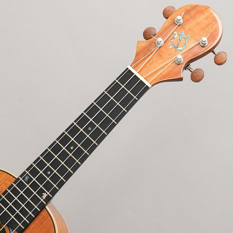 The honu design motif is used not only on the head shape but also on the 12th fret position mark.