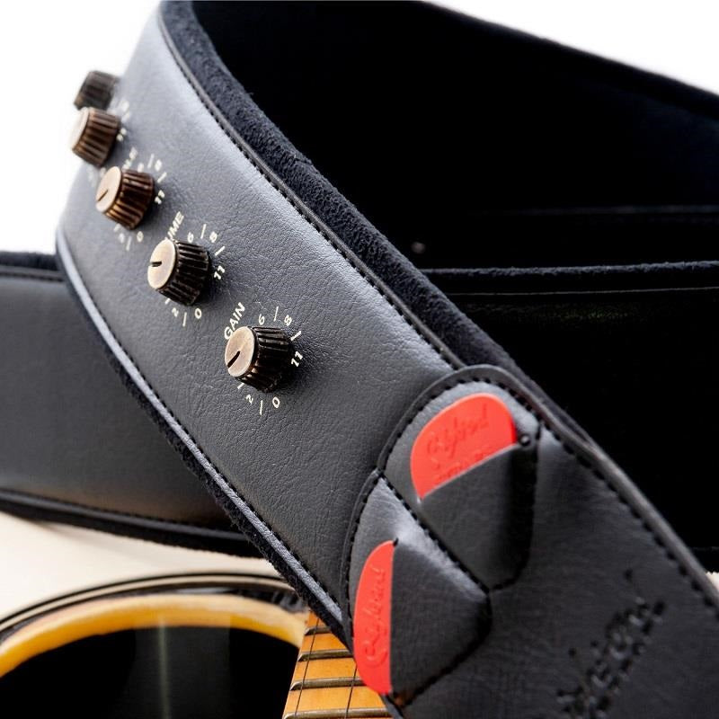 Metal parts reminiscent of the 11-step scale on the film-homage design amplifier and black vegan leather add a bold accent to the instrument.