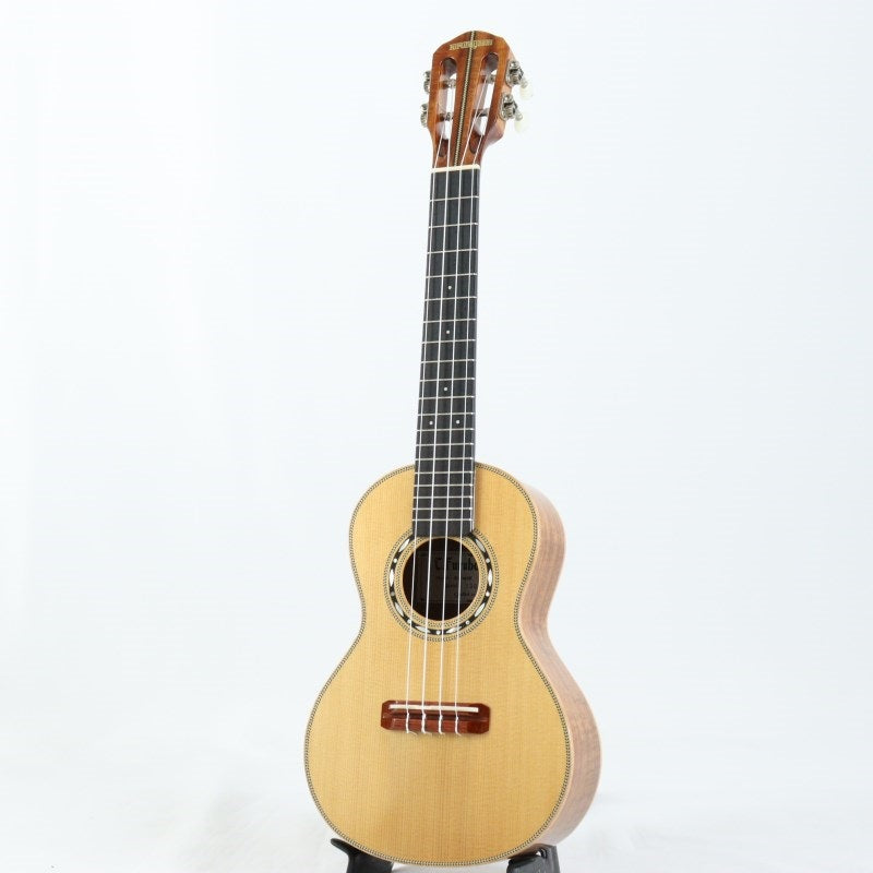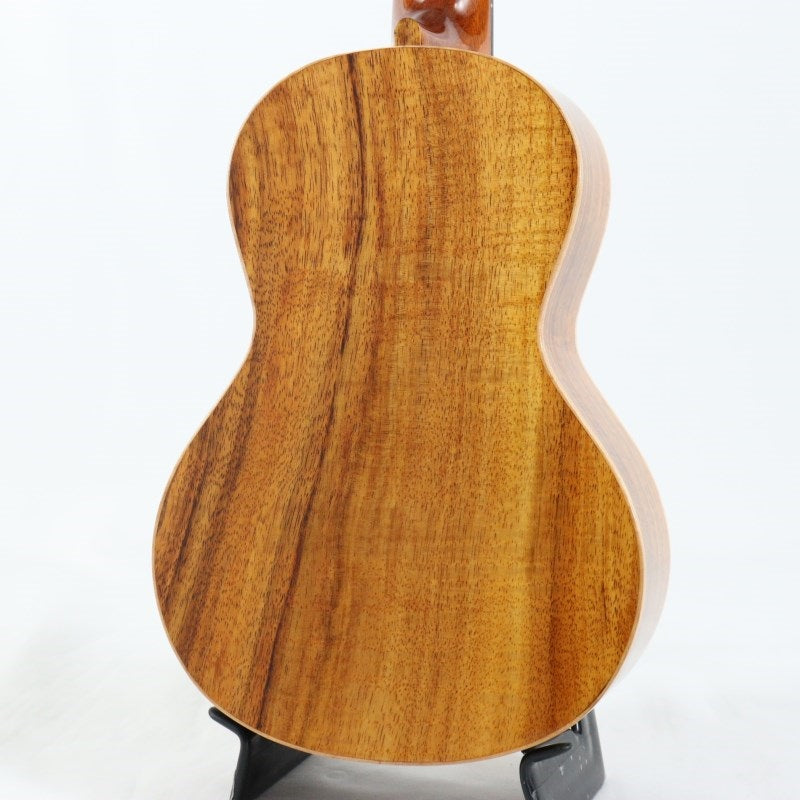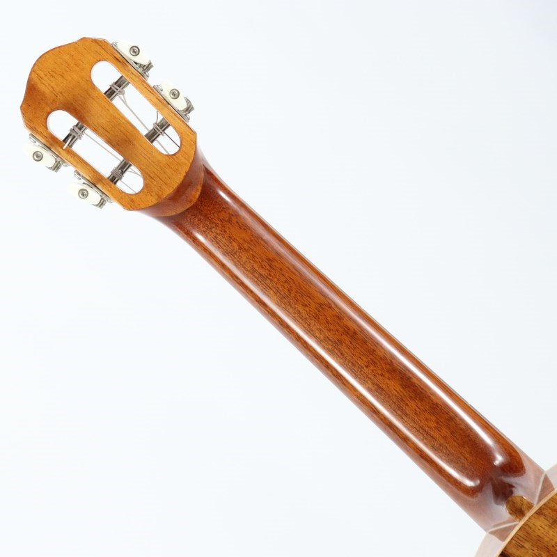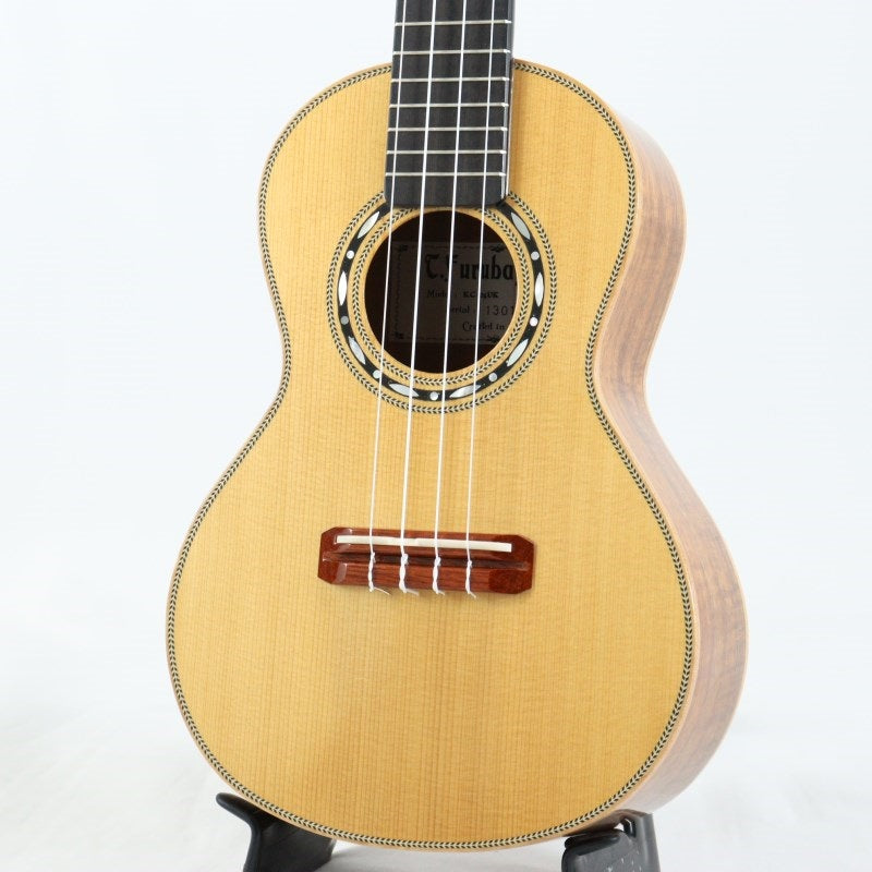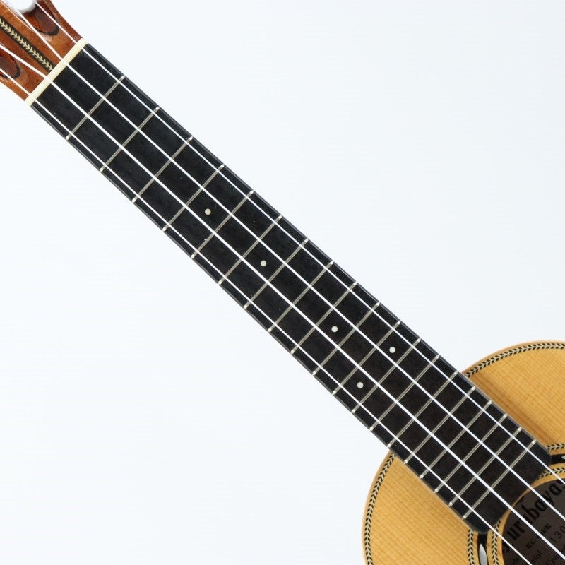 This is a concert model with a spruce top and koa sides and back. Its sound lies somewhere between a guitar and a ukulele, making it a perfect ukulele for Furubayashi, who builds and researches both guitars and ukuleles. Its crisp sound and easy-to-handle size, despite being a tenor, add to its appeal, while the maple binding and purfling on the shell give it a luxurious feel.