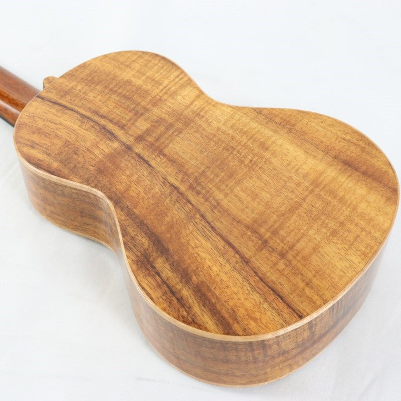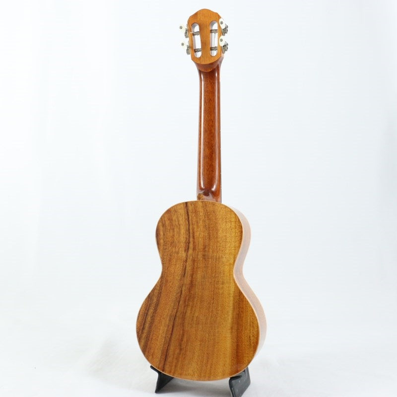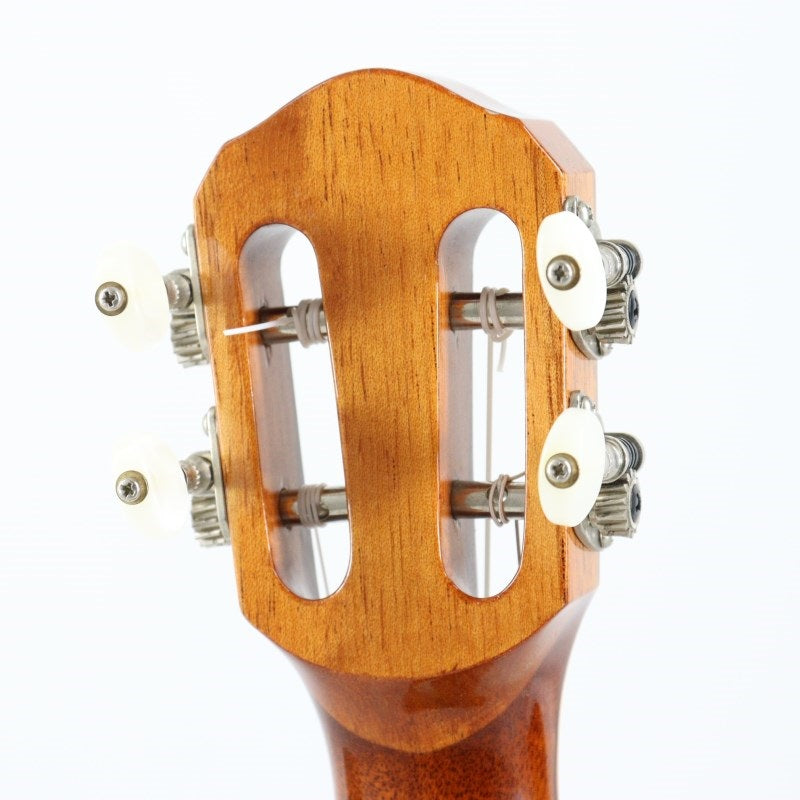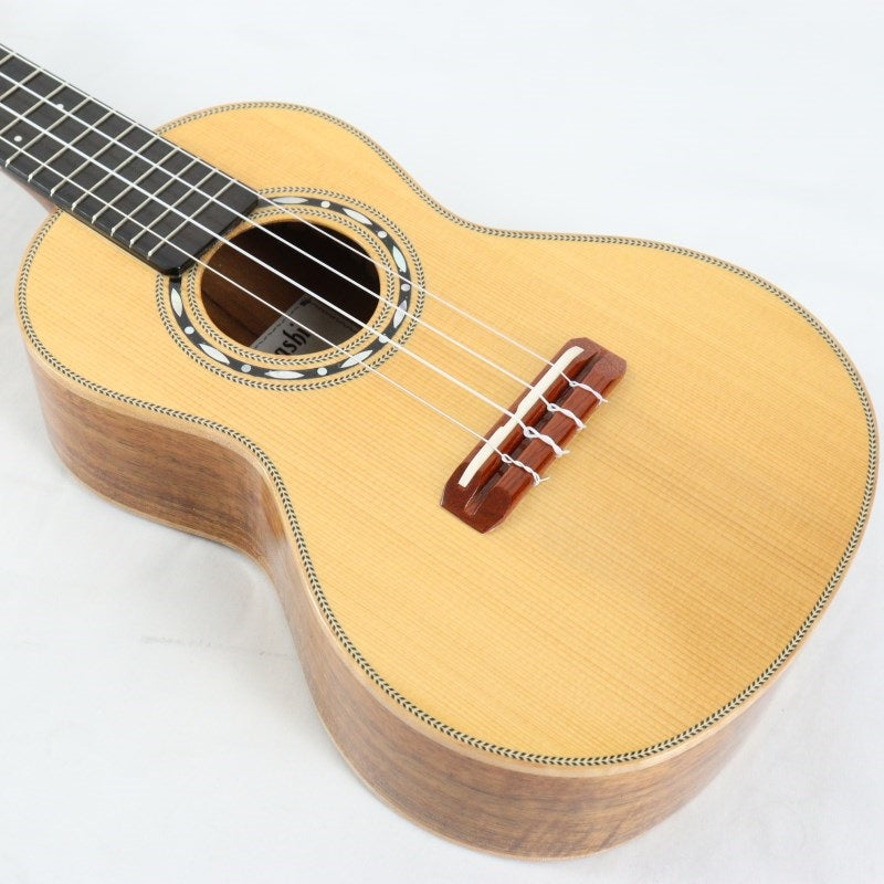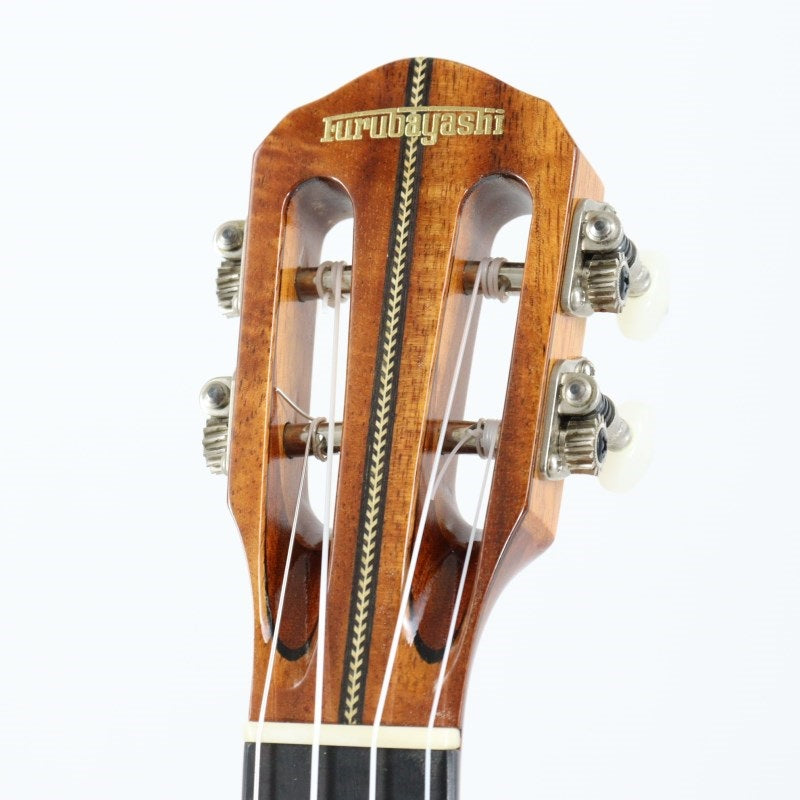 This is a concert model with a spruce top and koa sides and back. Its sound lies somewhere between a guitar and a ukulele, making it a perfect ukulele for Furubayashi, who builds and researches both guitars and ukuleles. Its crisp sound and easy-to-handle size, despite being a tenor, add to its appeal, while the maple binding and purfling on the shell give it a luxurious feel.