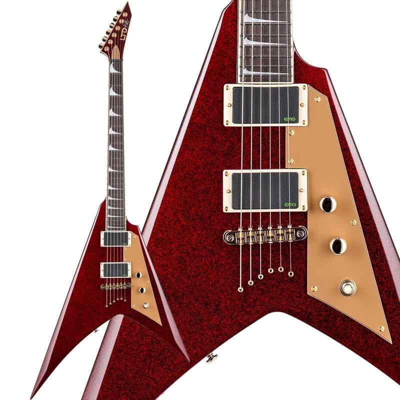 The pickups are Kirk's signature EMG Bone Breaker pickups. The bridge is a TonePros® with a stud-mounted body, and the strings are strung from the back of the body. The controls are simple: volume, tone, and pickup selector. The tuning machines are equipped with LTD locking tuners.
