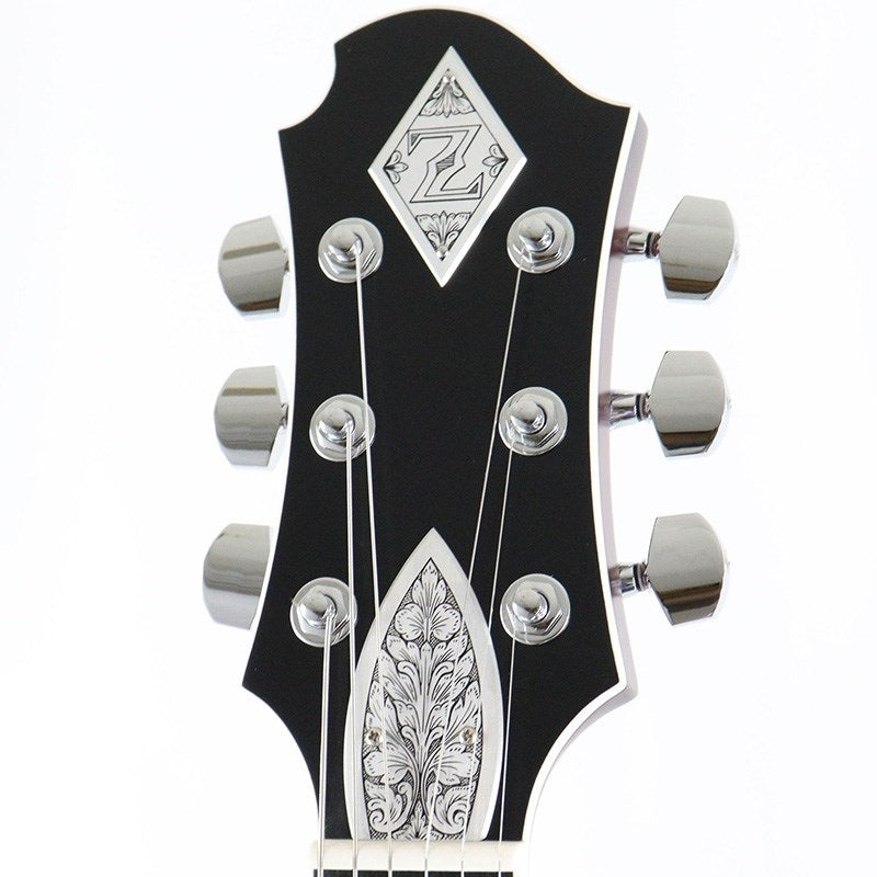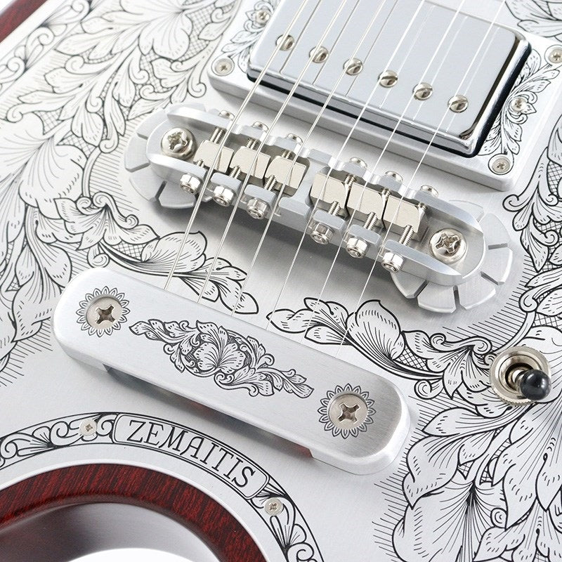 It features a 635mm scale, a set neck joint, and a medium-sized 22 frets. The large aluminum alloy plate on the body top is engraved with Zemaitis' signature leaf design, creating a classic look.