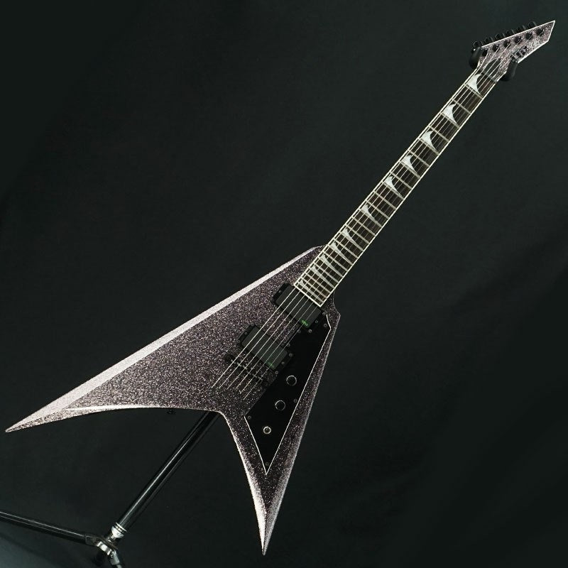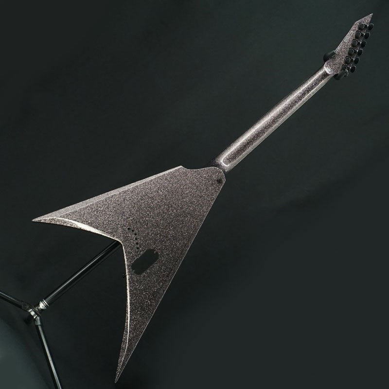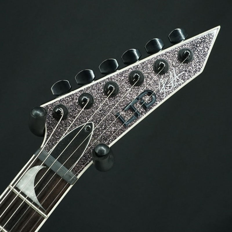 The guitar features a neck-through construction, a three-piece maple neck, and an asymmetrical V-shaped body with limba wood (korina) wing body. The fingerboard is made of Macassar ebony and features striking pearloid wave inlays. The pickups are Kirk's signature EMG Bone Breaker pickups. The bridge is a TonePros through-the-back pickup with stud mounting. The controls are simple: volume, tone, and pickup selector. The tuning machines are equipped with LTD locking tuners.
