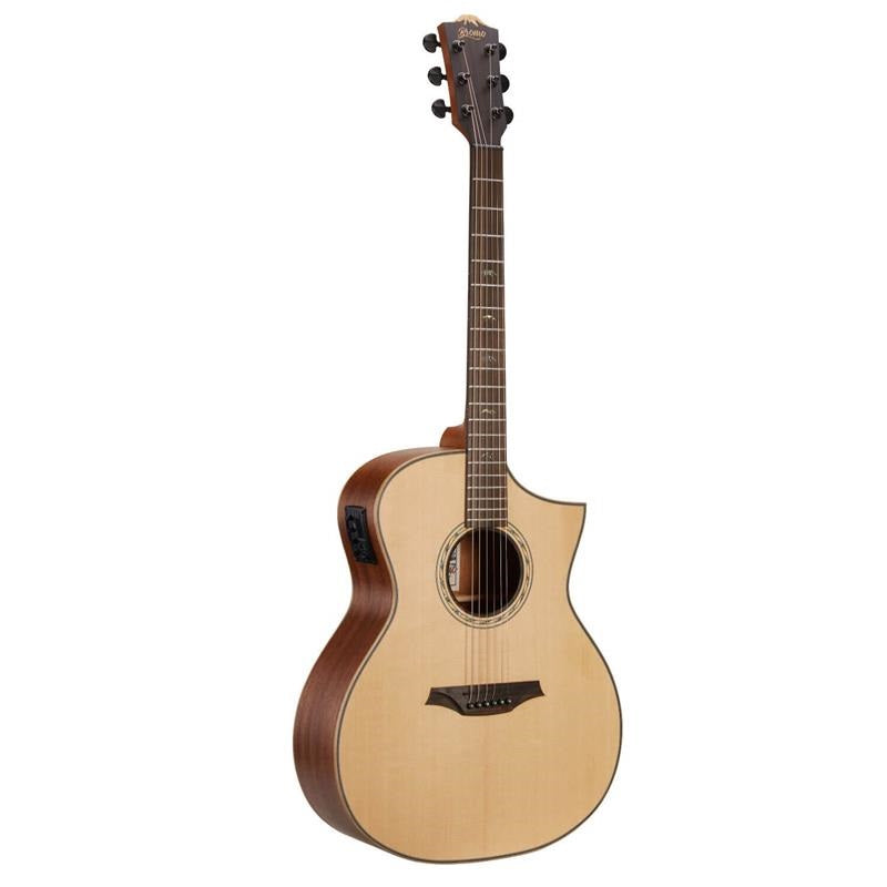 This solid-top model features a solid Sitka spruce top paired with carefully selected mahogany plywood back and sides. Sitka spruce offers a crisp, clear tone and captivating sustain, while the mahogany back and sides add warmth and fullness. This model also allows you to enjoy the nuances of a solid top over time.