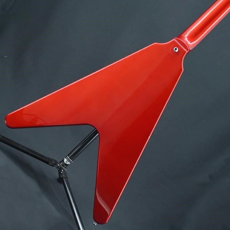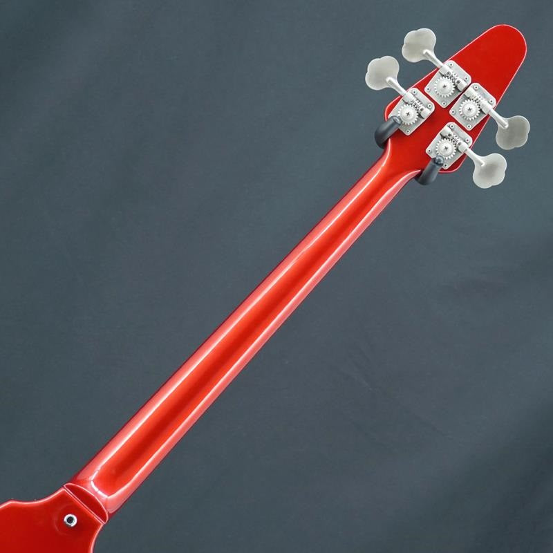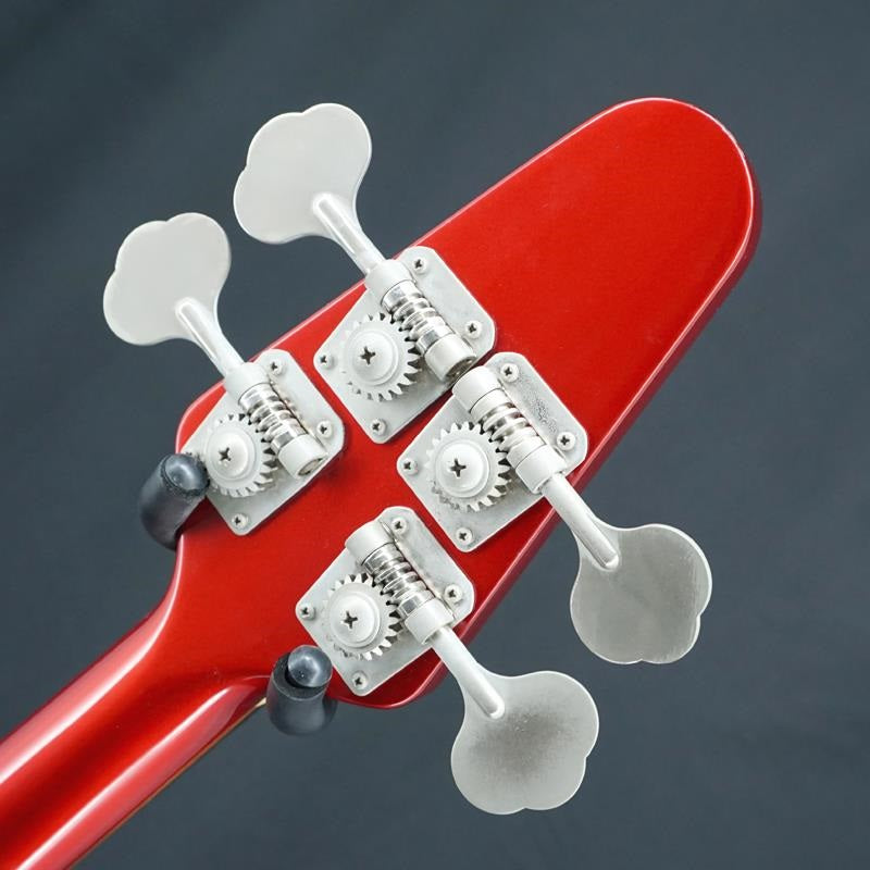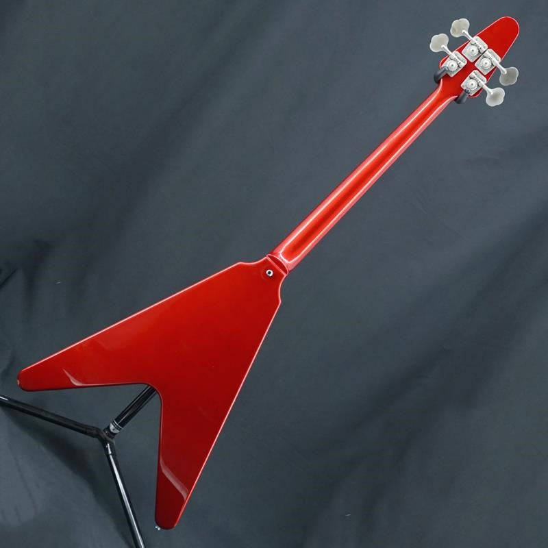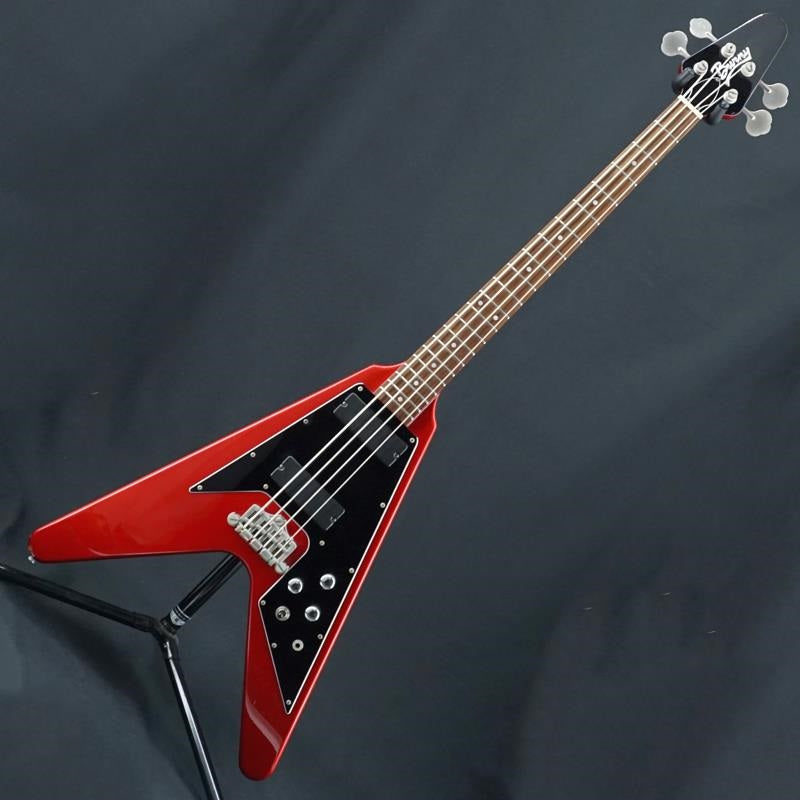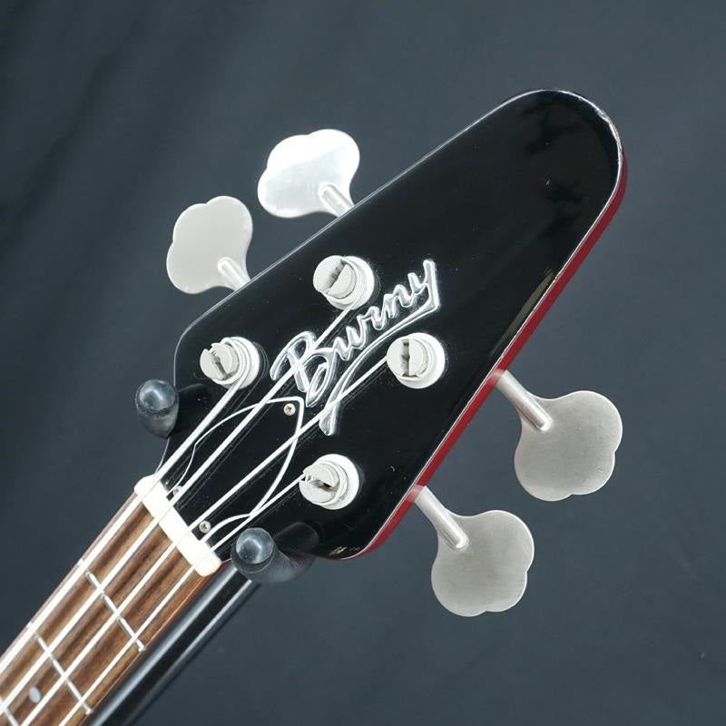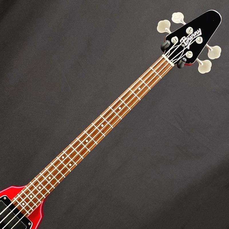 This eye-catching short-scale Flying V bass from the Burny brand features two humbuckers for a thick, powerful sound.