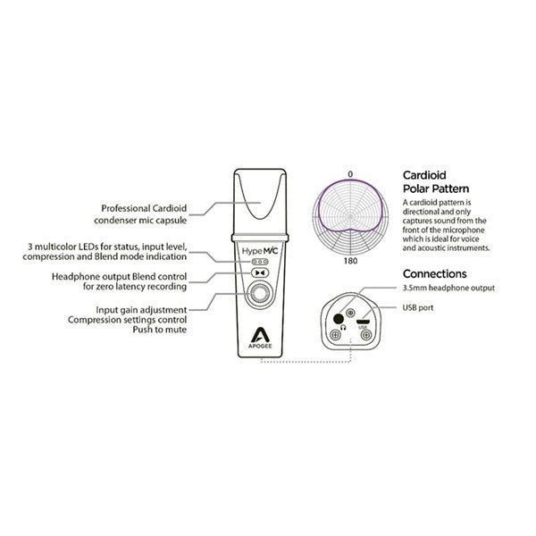 HypeMiC Features: Built-in studio-quality analog compressor; Crystal-clear sound quality up to 24-bit/96kHz with PureDIGITAL connection; High-quality cardioid condenser microphone capsule; Headphone output with Blend function for zero-latency monitoring; Tripod, pop filter, and dedicated case included; No complicated setup required. Plug and record with compatible audio apps; Compatible with iOS, Mac, and PC