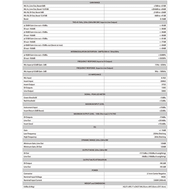 10dB variable boost function and foot switch MUTE foot switch 1/4 unbalanced output / XLR balanced output Ground lift switch 9VDC power supply