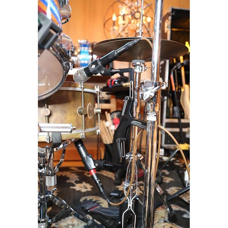 The FlexBar is a universal microphone holder designed to hold two microphones simultaneously on one microphone stand.