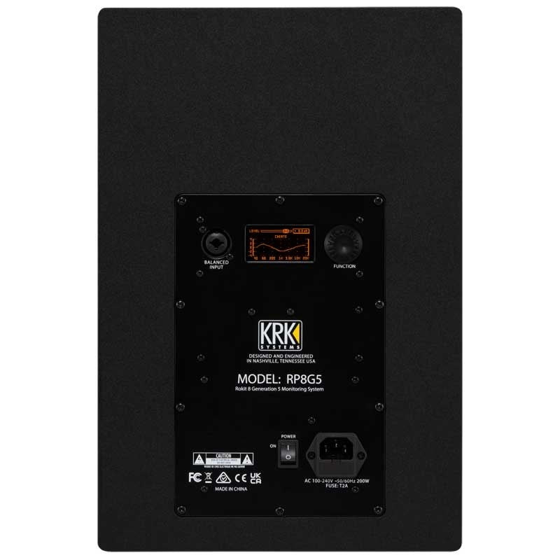The KRK ROKIT G5 is a powered monitor speaker that combines a Kevlar aramid fiber woofer with a simple silk dome tweeter. The package includes an isolation foam pad that allows for optimal listening angle adjustment, two faceplate options (a grill faceplate is installed at the time of shipment), and a highly visible DSP-driven equalizer and a custom amplifier with limiter, making it suitable for any working environment.