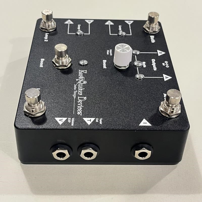 It features true bypass, two effect loops with our proprietary Flexi Switch, an output using an isolation transformer that can be selected via AB-Y, a buffered tuner output, a clean boost of up to 20dB, a volume control that can be controlled with an external expression pedal, and a high-headroom output buffer, making it easy to manage all the pedals on your pedal board in a compact space.