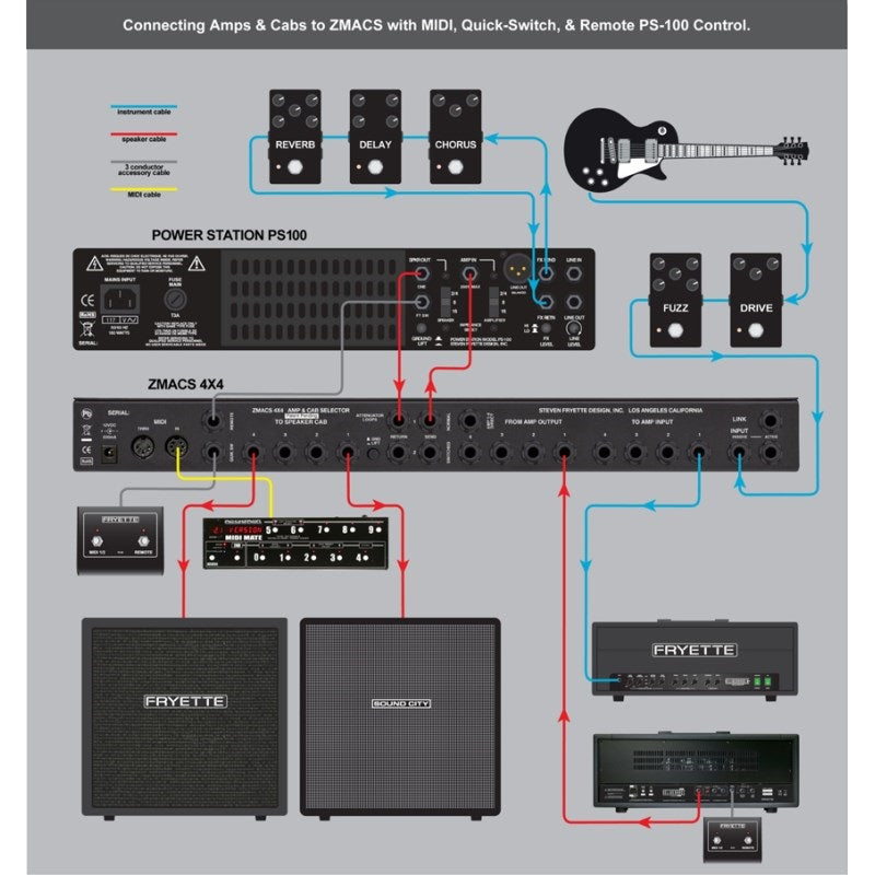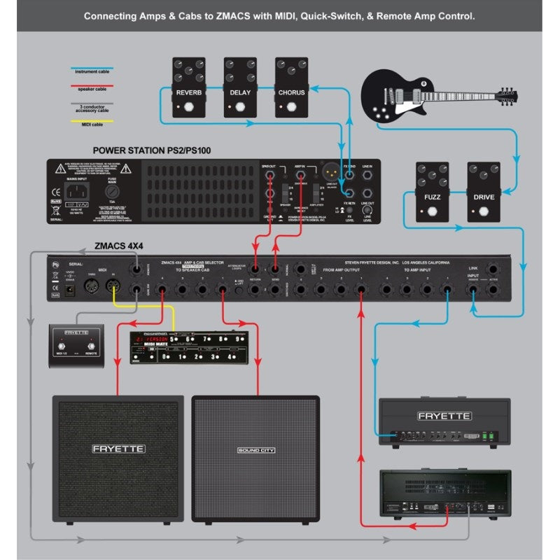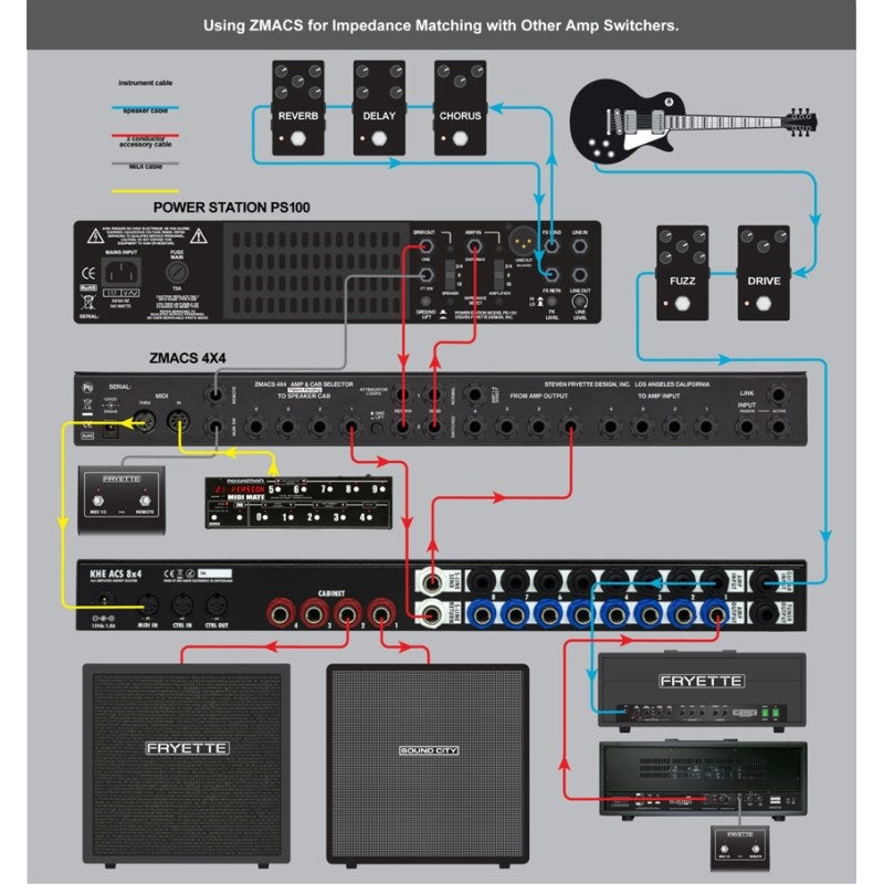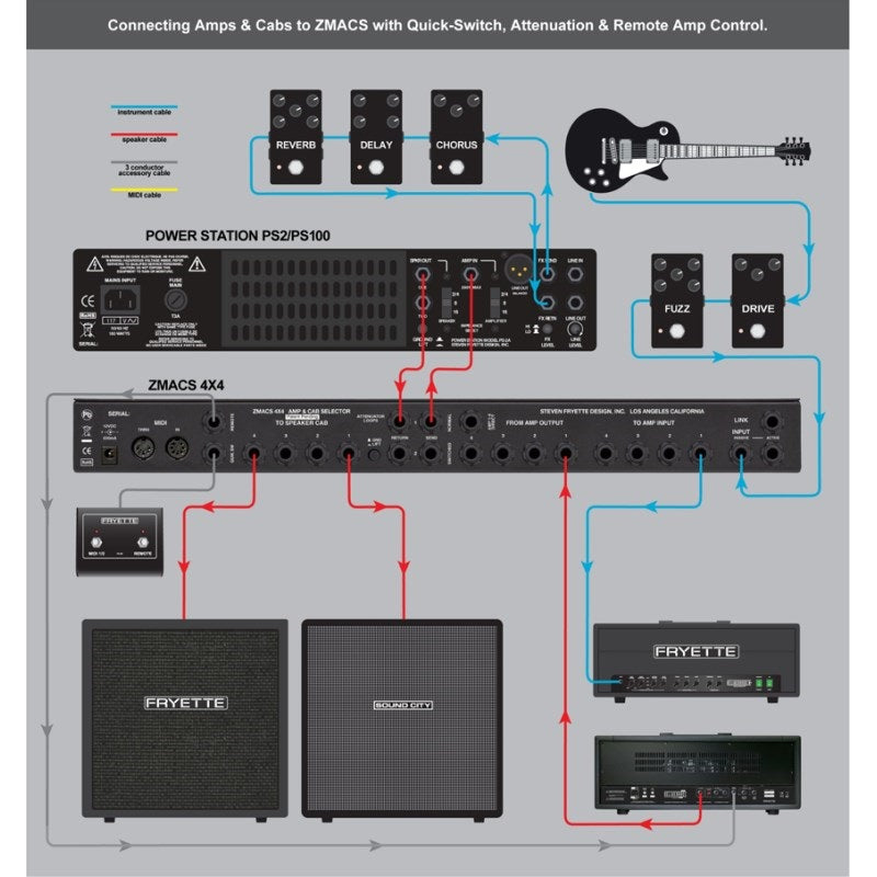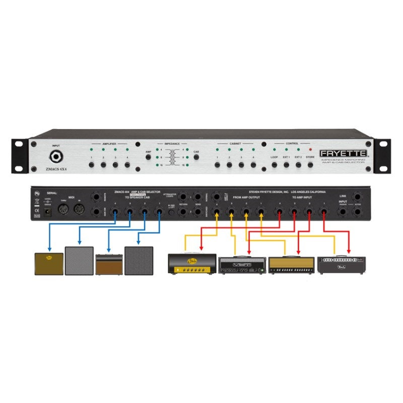 The ZMACS 4X4 lets you freely and instantly switch between combinations of up to four tube amps and up to four cabinets. You can instantly combine amps and cabinets and play without having to worry about messy speaker cables or impedance matching.