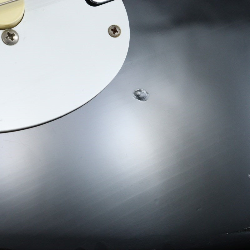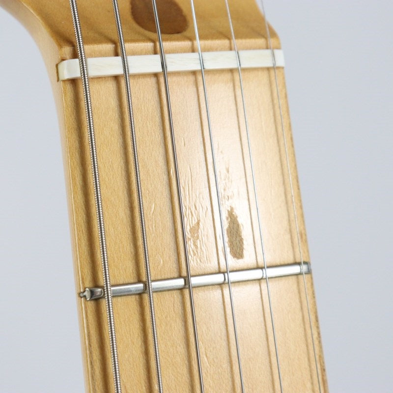 The electrical system is in good condition, but there are scratches, wear, and some paint peeling on the fingerboard, scratches and dents mainly on the body end, cracks in the neck pocket paint, and corrosion and dullness on other metal parts.