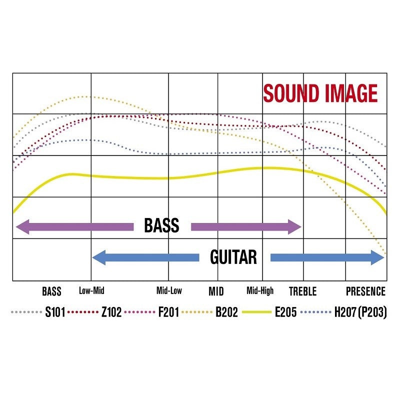 The sound, which thoroughly covers the mid-high range, brings out the harmonics that are considered to be ``delicious'' when playing rough cutting or chords in a more balanced way, and is designed to make it easier to produce the unique loud feeling that is required when driving the speaker with just a guitar amp.