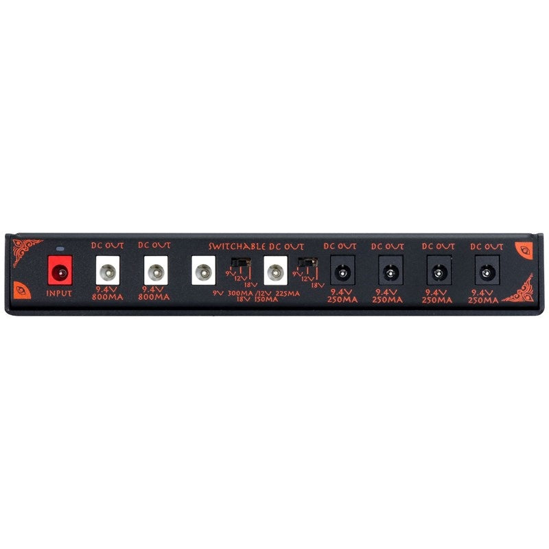 This power supply can be used as a pedal riser. We refined the idea of a pedal-riser-style power supply and created a unique power supply. All ports feature fully isolated circuits, with grounds completely separated. Four 9.4V 250mA outputs, two 9.4V 800mA outputs, and two ports switchable between 9V 500mA, 12V 375mA, and 18V 250mA, provide a wide range of voltage requirements. The 9.4V output jack is set to supply approximately 9.8V (under optimal conditions) at no load, maintaining 9.4V even under heavy load. This power supply adds volume and richness to your sound, especially when used with distortion and overdrive pedals, and can also boost brightness.