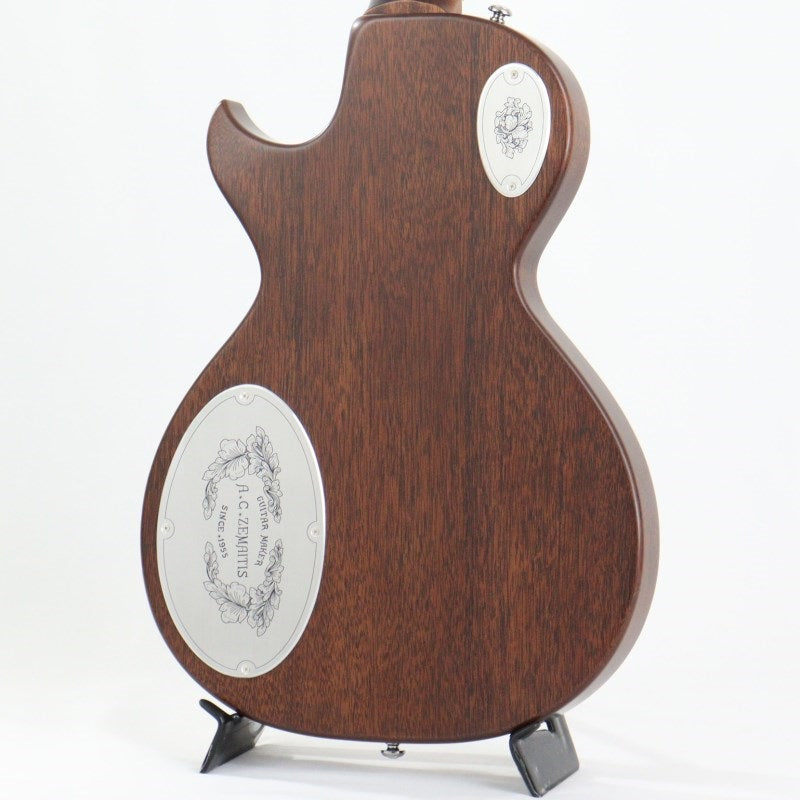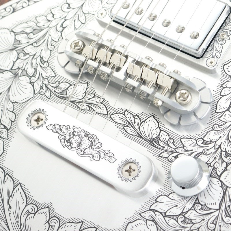 The body's aluminum alloy top plate is fully engraved with Zemaitis' signature leaf pattern, and the words "ACZEMAITIS SINCE 1955" are engraved to emphasize its classic look. The bridge and tailpiece are made of Zemaitis's original aluminum alloy, contributing to the distinctive Zemaitis tone. The diamond emblem on the headstock, truss rod cover, tailpiece, and pickup rings, as well as the output jack plate and control and switch back plate, are also made of aluminum alloy and feature engraving.
