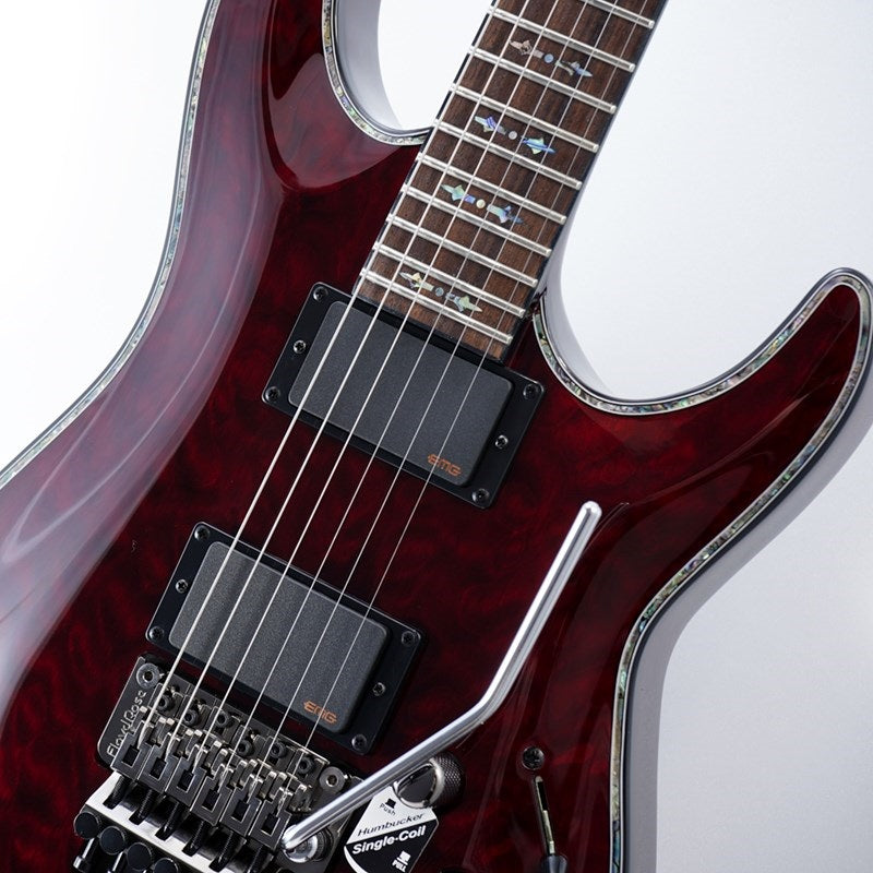 This Schecter Diamond Series "Hellraiser" model features a Floyd Rose bridge and a mahogany body with EMG Active 81-TW/89 pickups. The coil tap function allows for a wide range of tonal versatility, and of course, you can still enjoy the traditional, powerful sound!