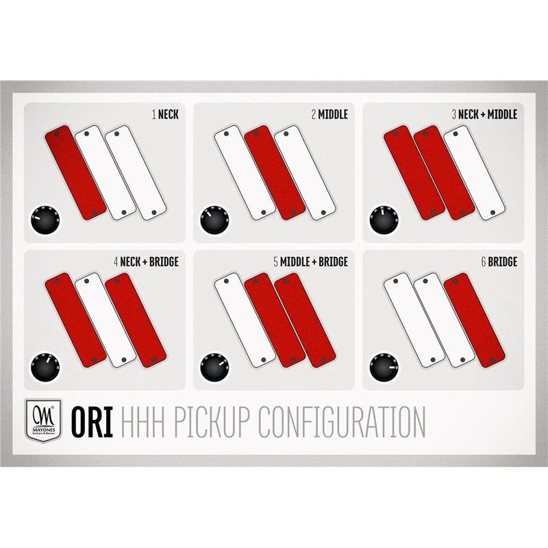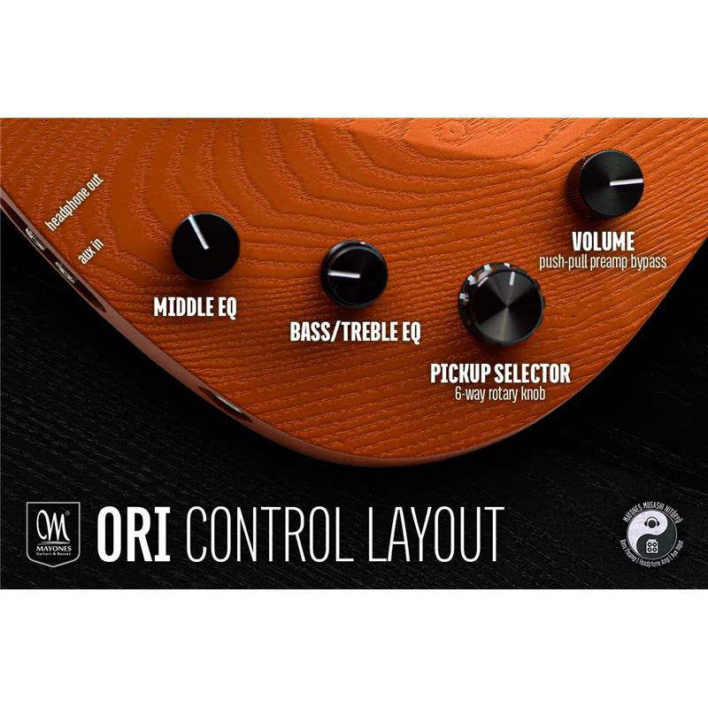 The three pickups are Mayones' original Velvetrone GRIM pickups using neodymium magnets, and the combination of a 6-position rotary selector and Musashi Nit?ry™ allows for a wide range of sound making.