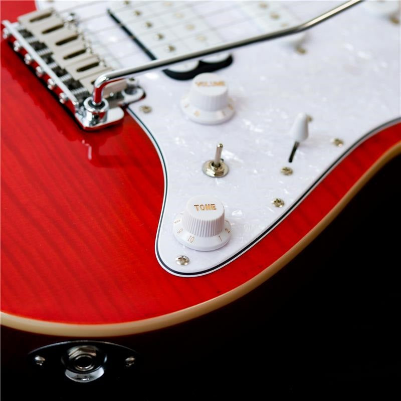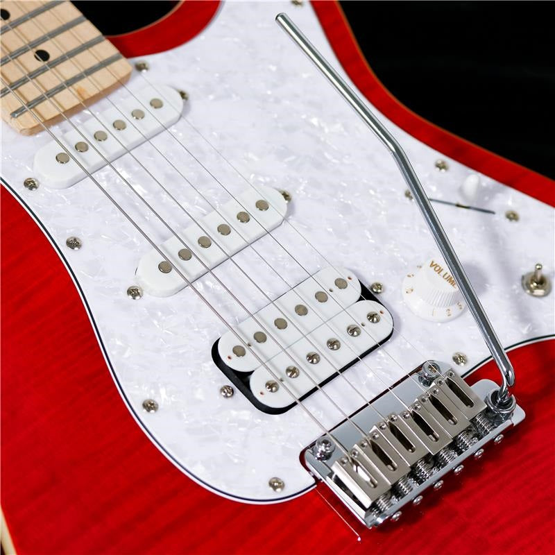 The SST-650 features a flame maple top and a gorgeous look. The vibrant coloring enhances the luxurious feel, giving it the presence of a high-end guitar. The pickups use an SSH layout, allowing for a wide range of sound creation, from clean to powerful, driven tones. This guitar will satisfy any player in both looks and sound.