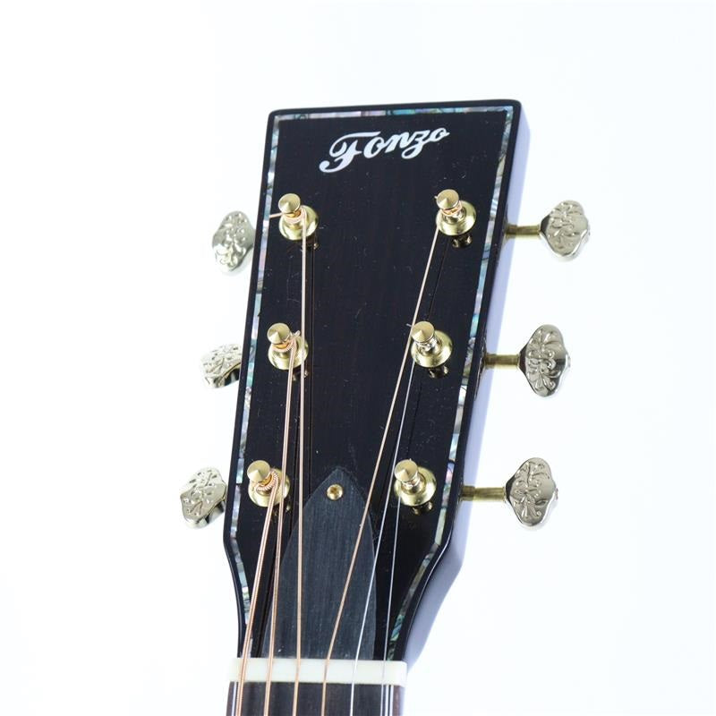 The V-34 series is the pinnacle of the Fonzo Guitar factory line. It features a unique design inspired by the Red Indian War Bonnet head dress. After comparing and examining many inlay materials, we created this unique inlay set using redwood, mahogany, cypress, and abalone.