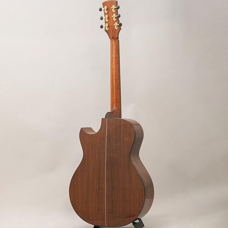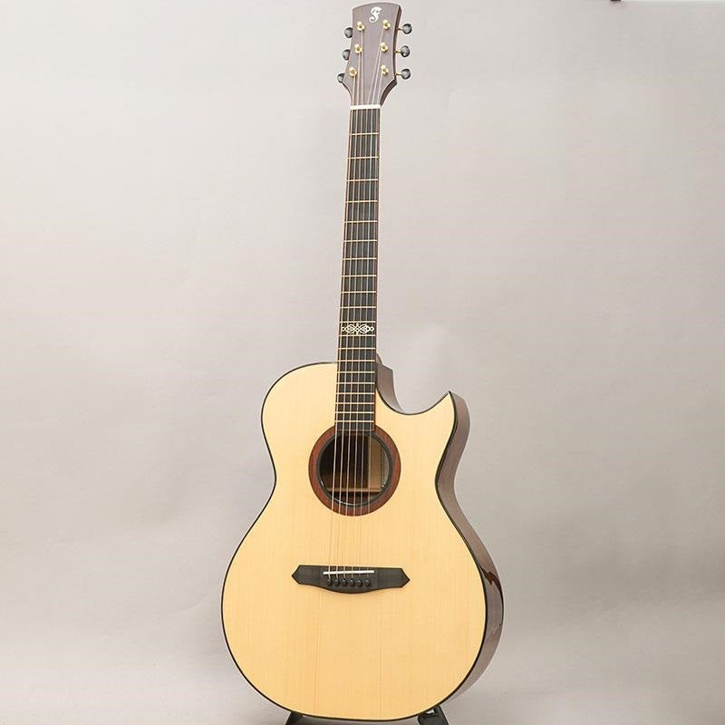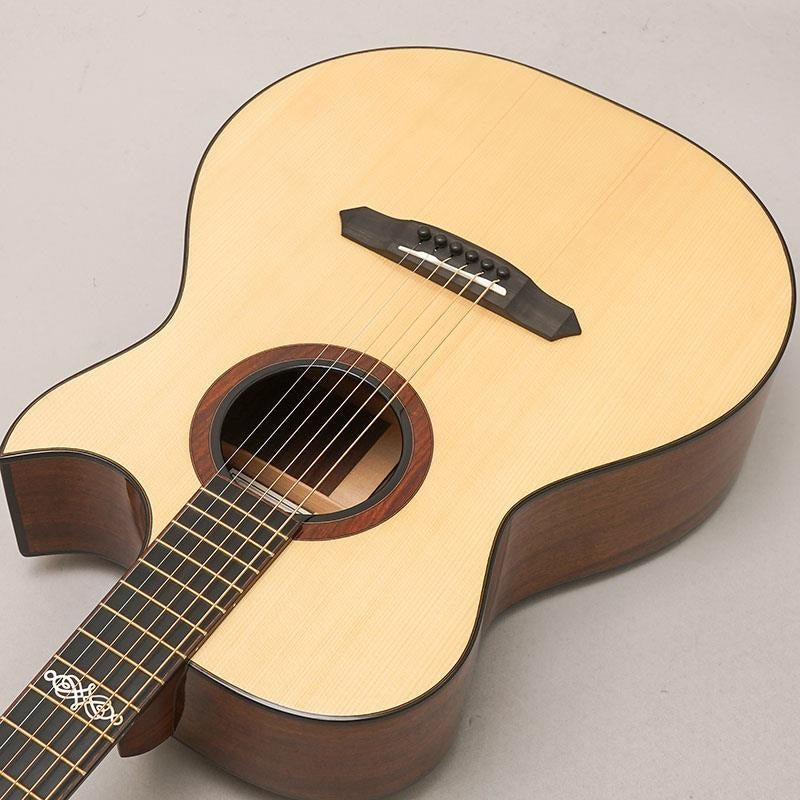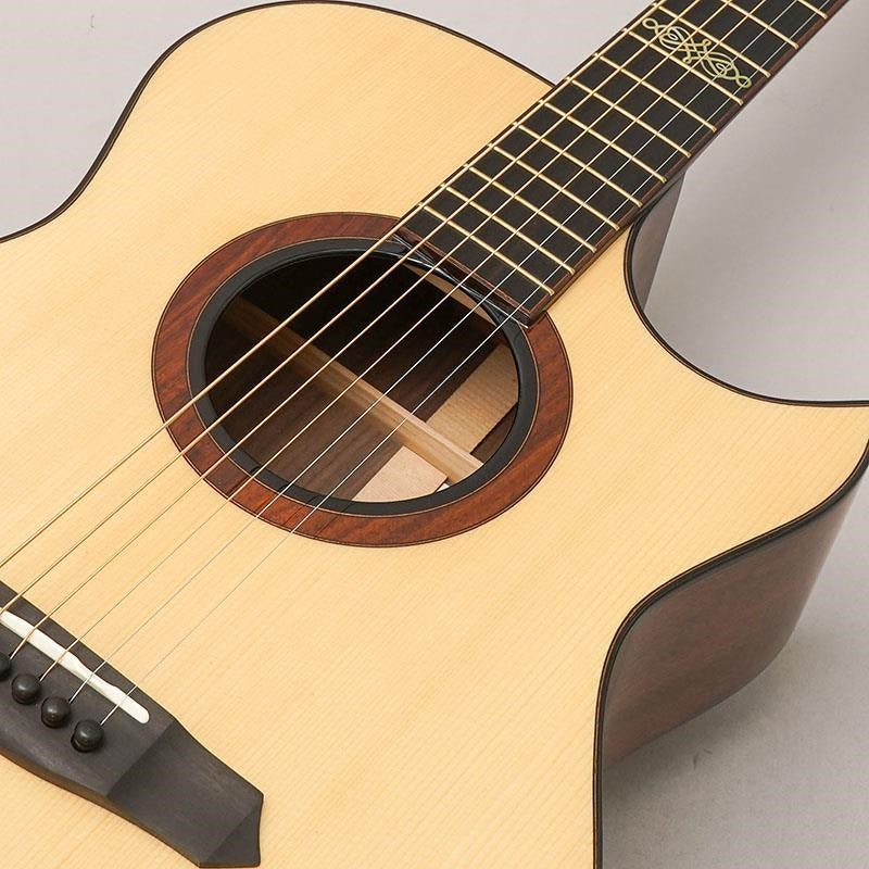 The V-33 series from the Fonzo Guitar Factory Line. The V-301 is an all-solid model with a minimalist design yet exudes a luxurious feel. The top is made of lightweight Engelmann Spruce, which offers excellent response, while the back and sides are made of beautifully grained Santos Rosewood. The original Premium Small Jumbo shape is neither too small nor too large, reducing strain on the player. This player-focused series offers a well-balanced sound from low to high notes.