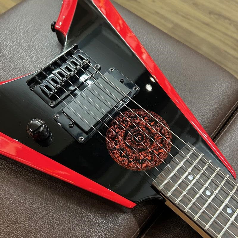 This is the limited-edition BABY METAL MINI-ARROW. Despite its miniature V-shaped body measuring approximately 1 meter in length, it delivers a powerful sound thanks to its humbucking pickups. This premium guitar is a coveted favorite among guitar fans, and is currently difficult to obtain!